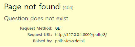 polls/views.py에 detail 부분을 다음과 같이 수정해 보겠습니다.from django.http import Http404