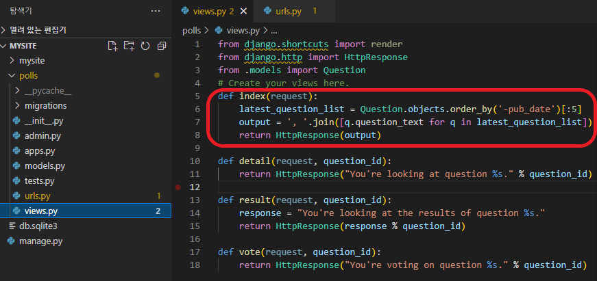 polls/view.py에 index부분을 다음과 같이 수정해 주세요.